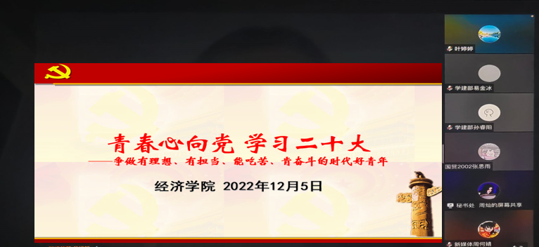 为学习贯彻党的二十大精神,进一步凝聚思想共识,发挥我院学生干部的先锋模范作用,勇担青春使命,12月5日,565net必赢客户端分团委线上开展了以“青春心向党 学习二十大”为主题的二十大精神宣讲会,学院青马工程学员及部分年级学生干部参加。